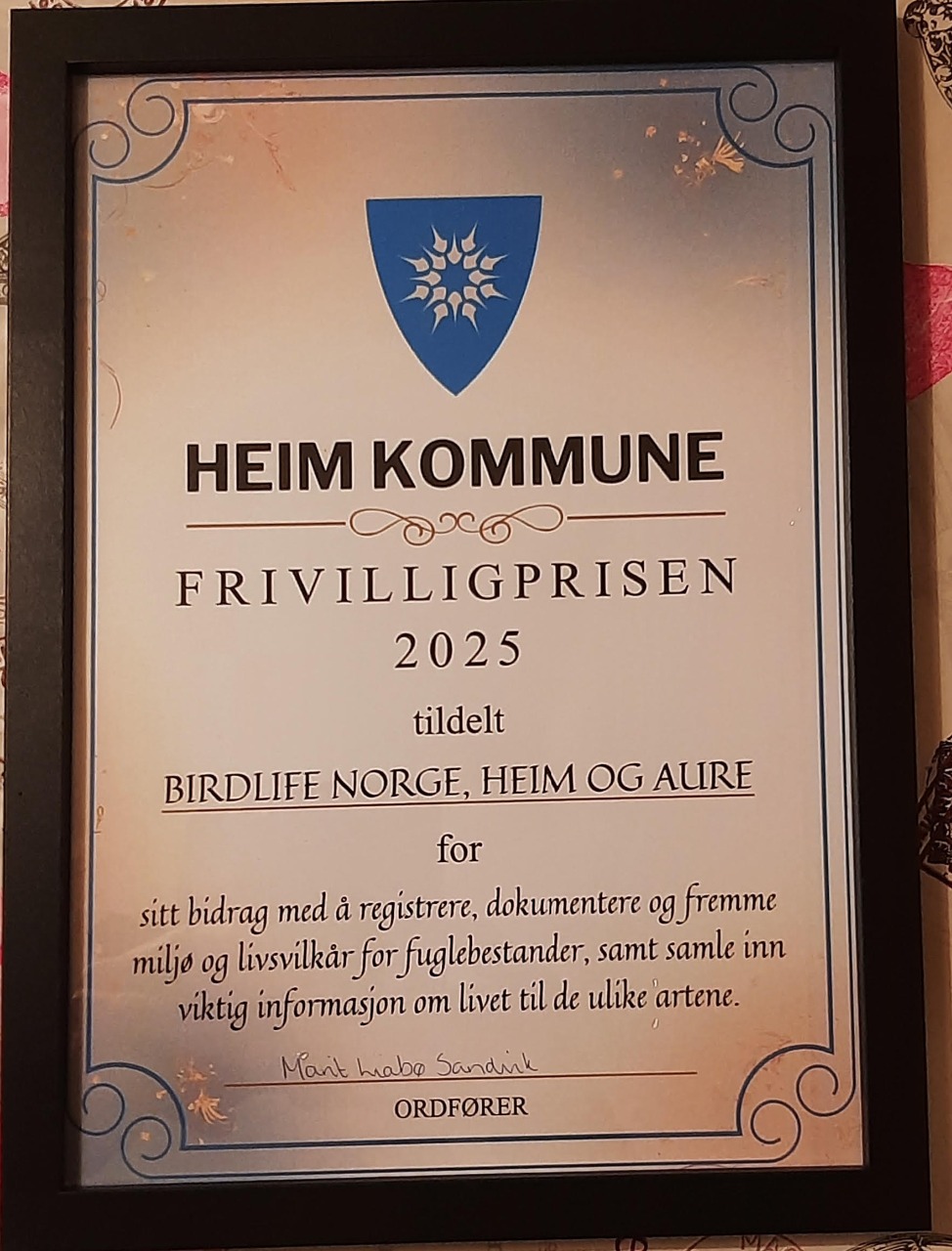 Under Heim kommunes årlige frivilligforum på Kyrksæterøra ble BirdLife Heim-Aure lokallag tildelt årets frivlligpris. Prisen ble tildelt for foreningens langvarige "bidrag med å registrere, dokumentere og fremme miljø og livsvilkår for fuglebestander, samt å samle inn viktig informasjon om livert til de ulike artene".